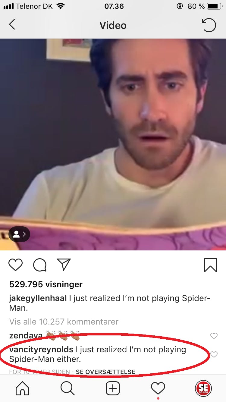 Ryan Reynolds er blandt dem, der har kommenteret Jake Gyllenhaals første Instagram-post. Foto: Instagram