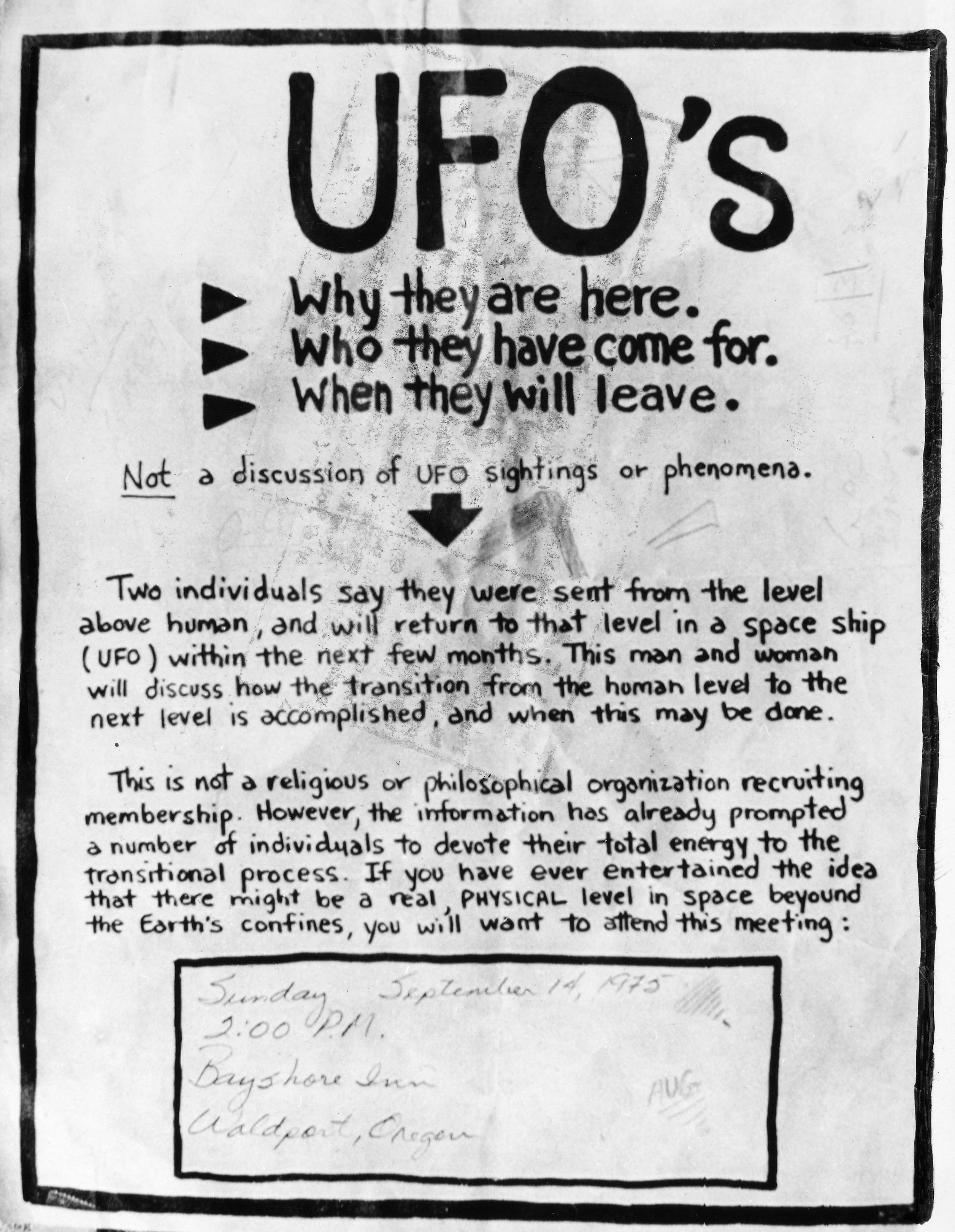 Sådan lød invitationen til kultens møde på en plakat, da de i 1975 var forbi Waldport, Oregon, USA, for at tiltrække nye medlemmer.
