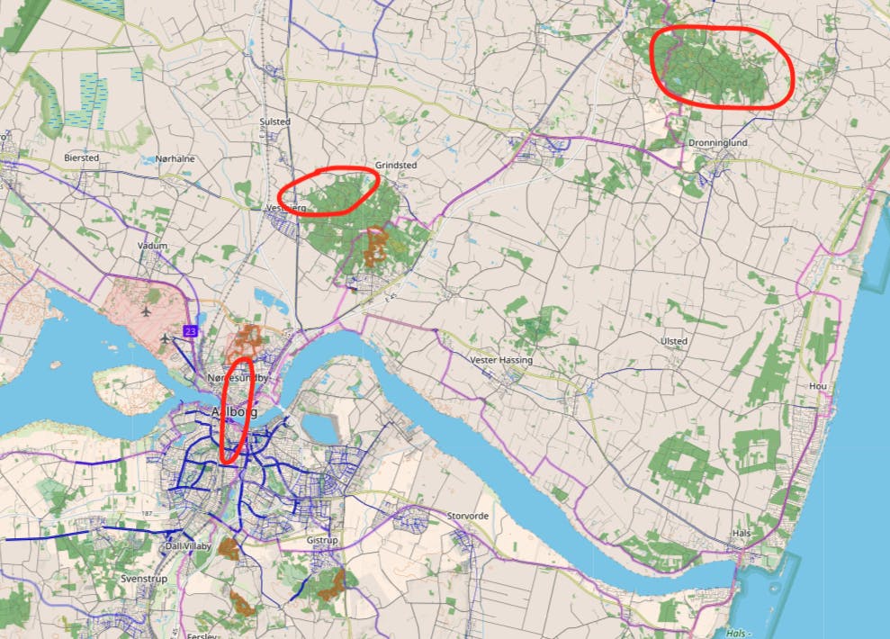 Hvad skete der med Mia og de mistænkte bag hendes drab i disse tre områder? Og hvad udsatte de den 22-årige kvinde forpå vejen rundt i Nordjylland? Det er nogle af de vigtigte sorte huller i politiets efterforskning, der nu skal fyldes ud. Grafik: OpenStreetMap